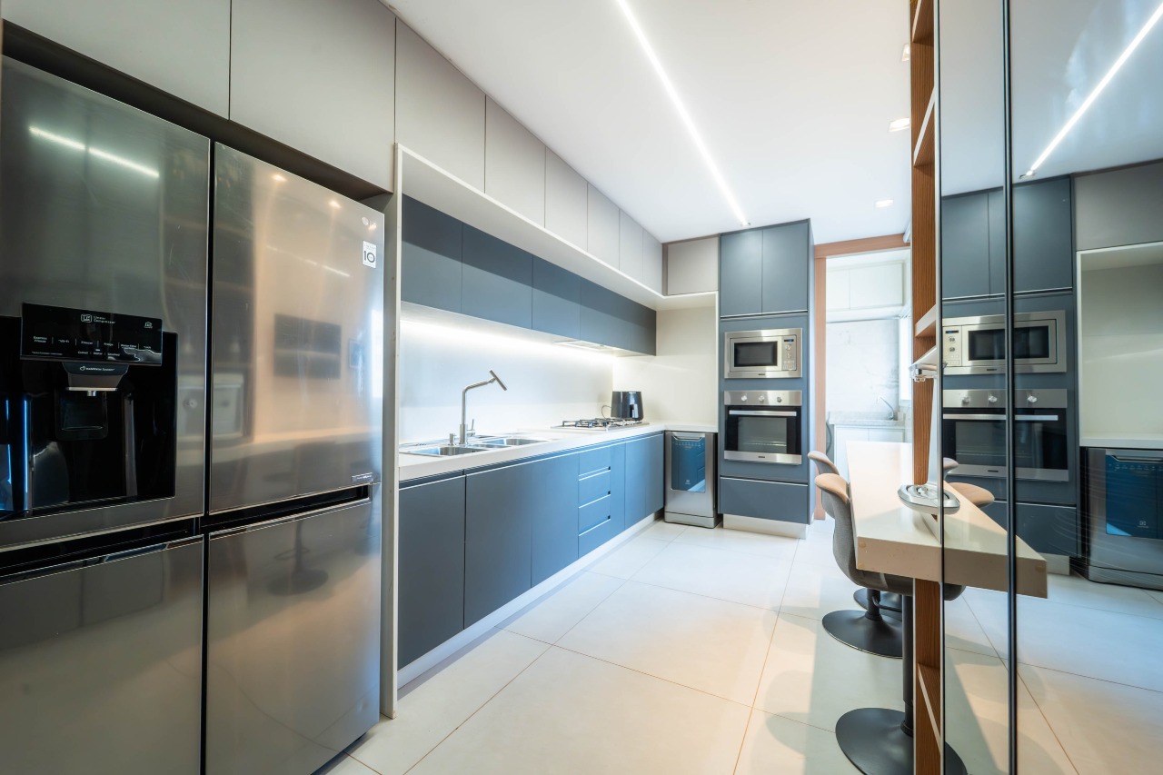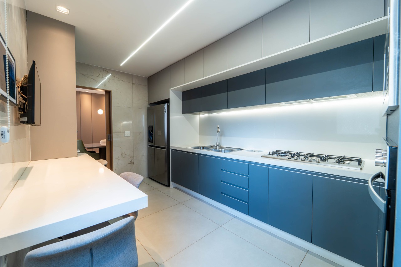 Cozinha completamente planejada, mobiliada, funcional, espaçosa e ventilada. Área de serviço independente e funcional.